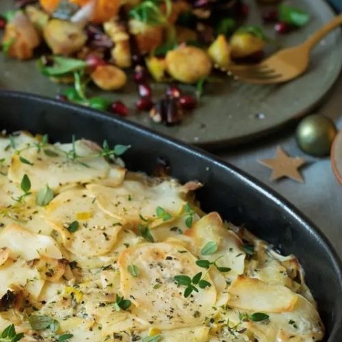 Gratin van aardappelen/prei, portobello en geroosterde groenten