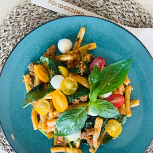 Pasta met spinazie, gehakt en tomatensaus, mozzarella