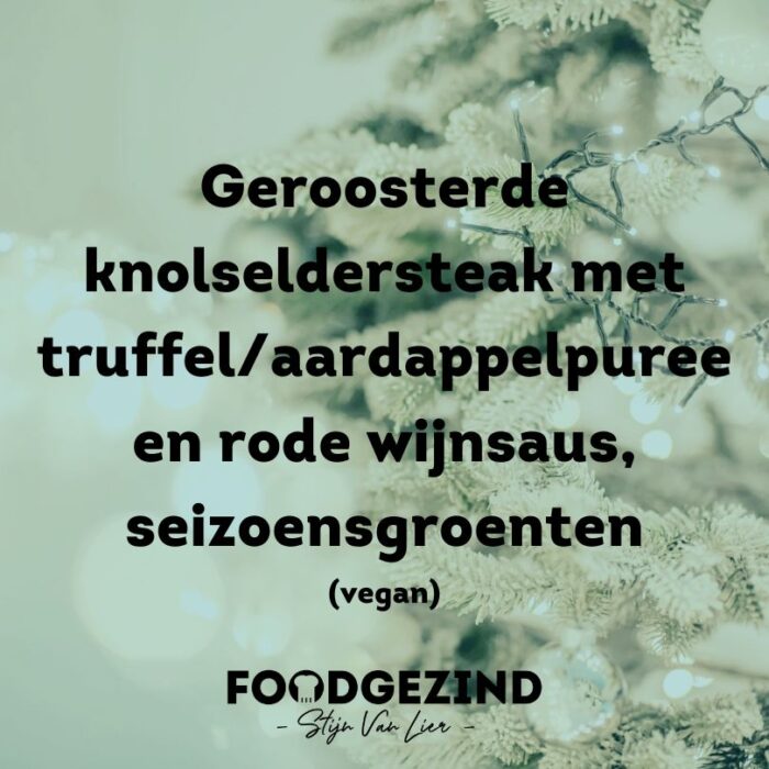 Geroosterde knolseldersteak met truffel/aardappelpuree en rode wijnsaus, seizoensgroenten 25/12