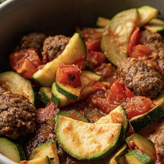 Typisch grieks stoofpotje: kruidige gehaktrolletjes met evenveel groenten als vlees (courgette, tomaat, ui, sjalot, look) – kruiden: paprikapoeder, koriander, kaneel, komijn, oregano en basilicum