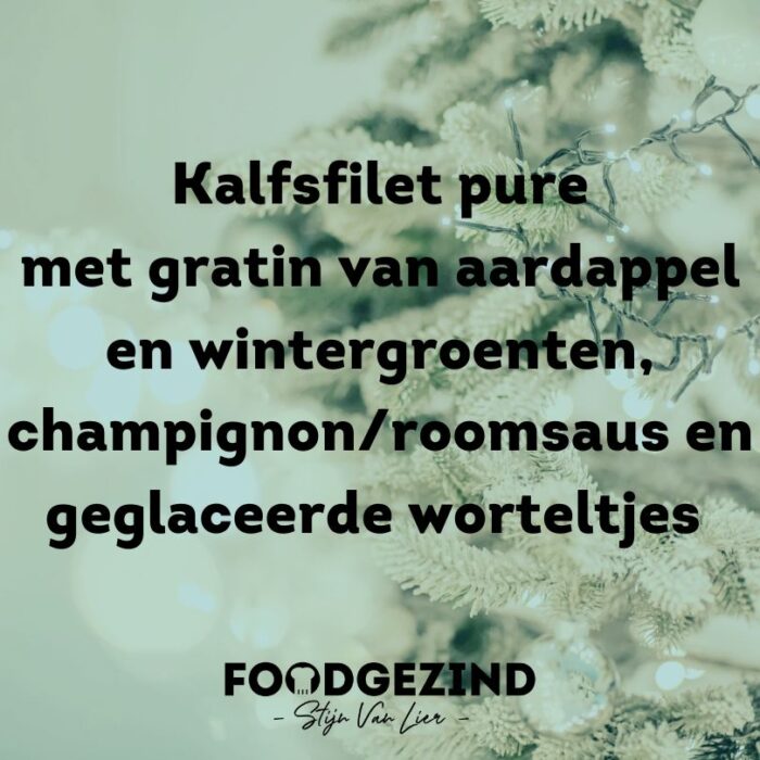 Kalfsfilet pure met gratin van aardappel en wintergroenten, champignon/roomsaus en geglaceerde worteltjes 24/12