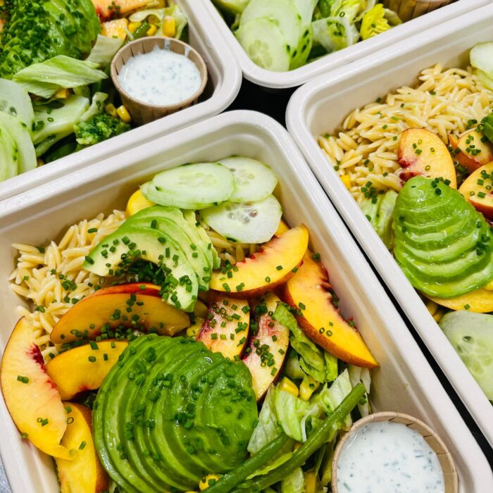 Orzosalade met perzik, groene groenten (boontjes, broccoli, komkommer, sla), mais, fetasaus