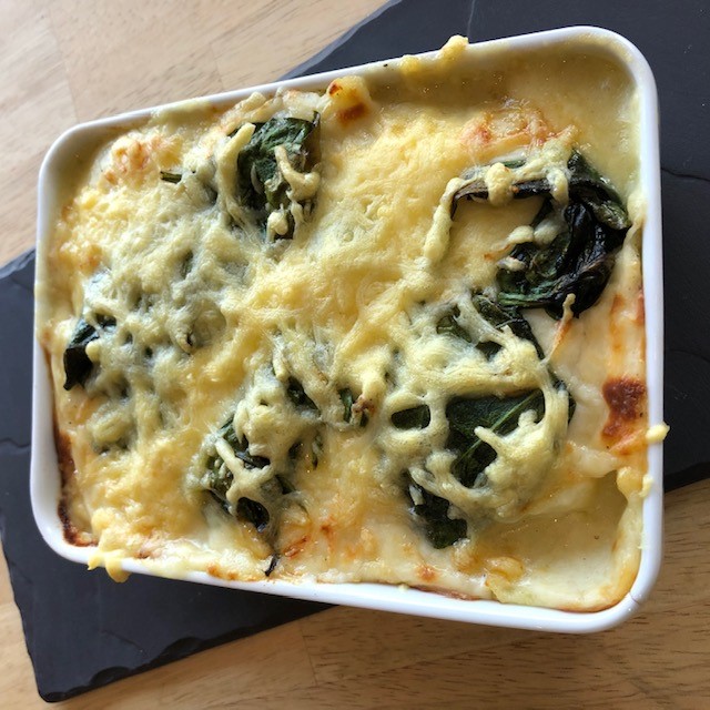 Heerlijke ovenschotel met bloemkool, spinazie, varkens-rundgehakt, puree en kaassaus