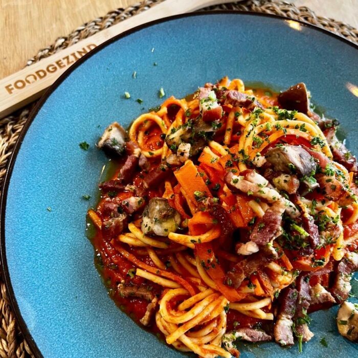 Mix van spaghetti (pasta) & zoete aardappelspaghetti met tomaten-looksaus, spekjes en champignons