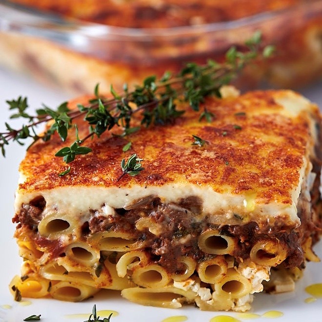 Pastitsio is traditioneel Grieks gerecht: een pastaschotel met gehakt en groenten en holle pasta.