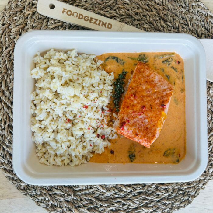 Romige Toscaanse zalm in de oven met knoflook, tomaat, spinazie en volkorenrijst