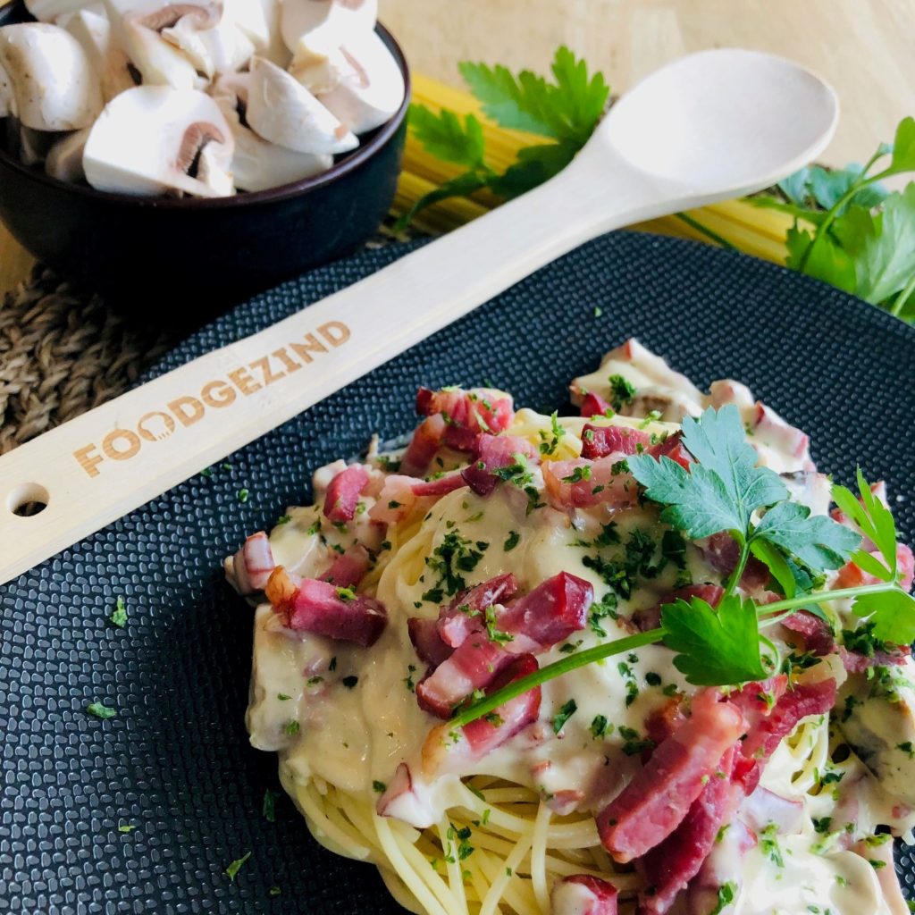 Een echte pasta-klassieker, kids ’s favorite: onze spaghetti carbonara met champignons en spekjes