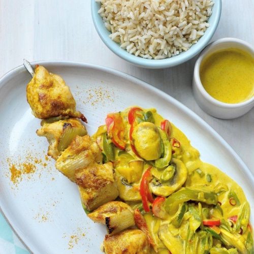 Kalkoenbrochette met rijst en groenten in zachte curry