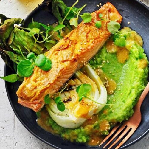 Wasabi-puree (met aardappel, knolselder, erwtjes), miso-zalm en gesmoorde venkel