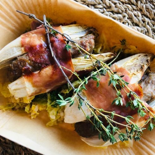 Gebakken schelvis met pancetta, stoemp van groene kool, mosterdsaus