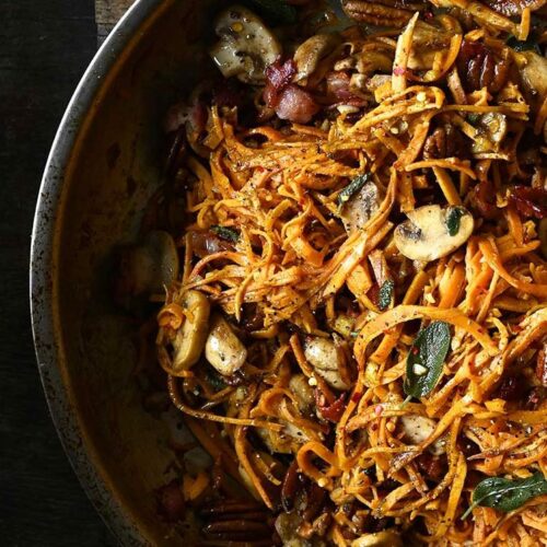 Pasta- & zoete-aardappelslierten met spekjes, champignons, tomaten-looksaus