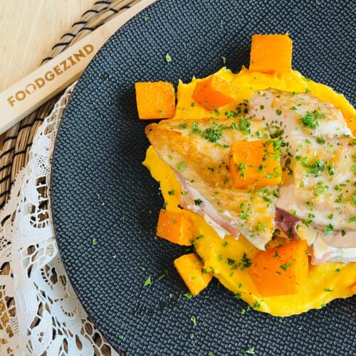 Pompoenpuree, opgerolde kip met ham en mosterd