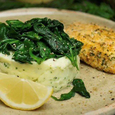 Wijting in een korstje met aardappel-knolselderpuree en spinazie
