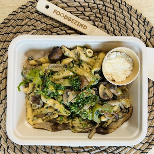 Pastaschotel met pompoen, paddestoelen, ricotta