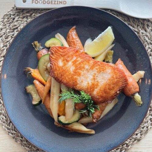 Zalm met gebakken asperges, jonge wortel en krieltjes, citroen/mosterdvinaigrette