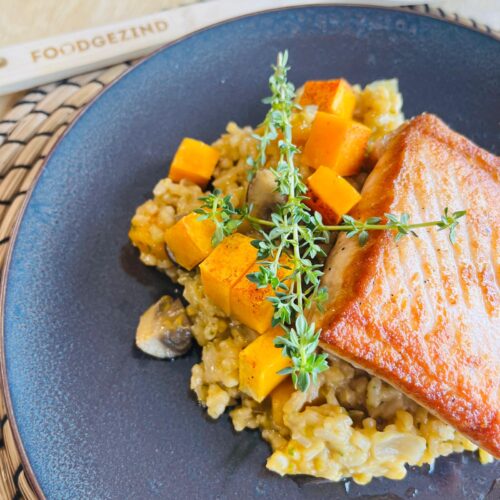 Pompoenrisotto met champignons en gebakken zalm