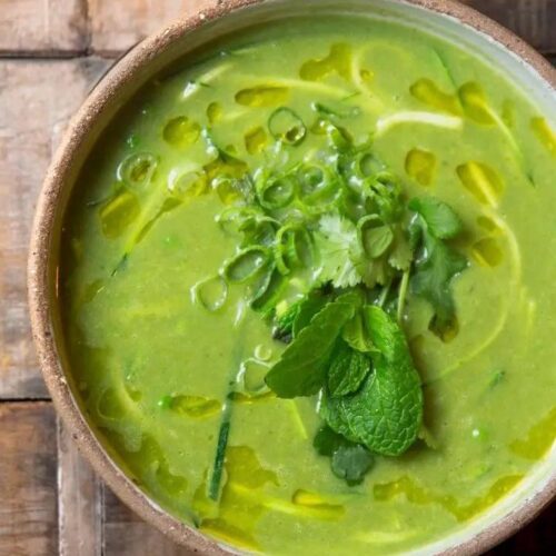 Groene groentensoep met groene curry en kokos