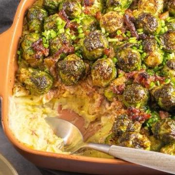 Spruitjes ovenschotel met aardappelpuree en spekjes
