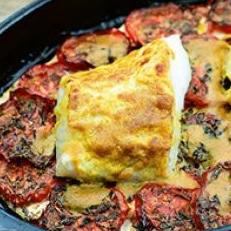 Kabeljauw met knolselder en tomaat, mosterdsausje