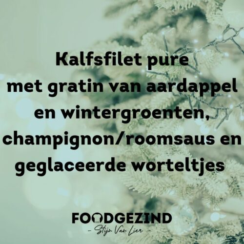 Kalfsfilet pure met gratin van aardappel en wintergroenten, champignon/roomsaus en geglaceerde worteltjes 25/12